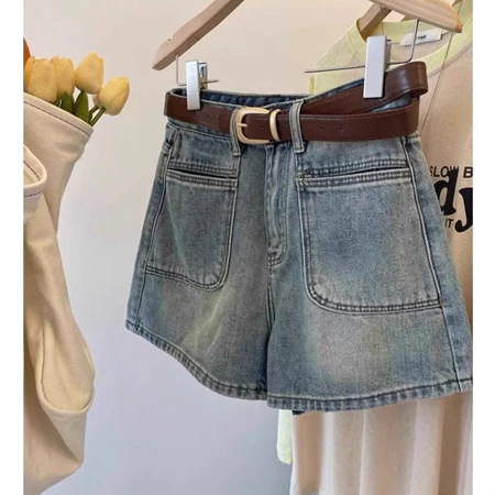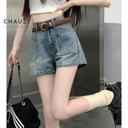 Quần Short Denim Chauzi Lưng Cao Phối Túi Trước – Phong Cách Hàn Quốc